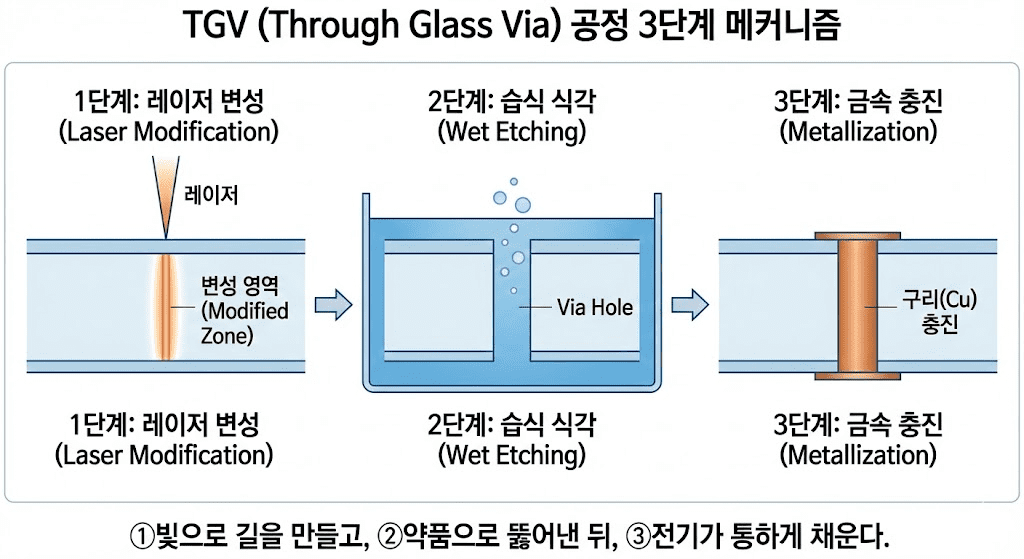 유리 기판의 핵심은 **”유리에 구멍 뚫기”**입니다. 전기가 통하는 길을 만들어야 하는데, 유리는 충격을 주면 깨집니다. 그래서 등장한 기술이 **TGV(Through Glass Via)**입니다.